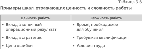 Все шкалы делятся на две группы: шкалы, отражающие сложность работы, и шкалы, отражающие ценность работы для компании (табл. 3.6). Очевидно, что и то и другое важно для определения размера оплаты труда. Чем сложнее работа, тем больше мы должны за нее платить. За более ценную работу тоже лучше платить больше (хотя это чуть менее обязательно). Представим себе, что не очень сложная работа по внесению неких данных в компьютер приобрела для нас необыкновенную значимость. Повысим ли мы за нее оплату? Пожалуй, да, чтобы взять на эту важную работу максимально квалифицированного и надежного человека.