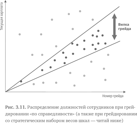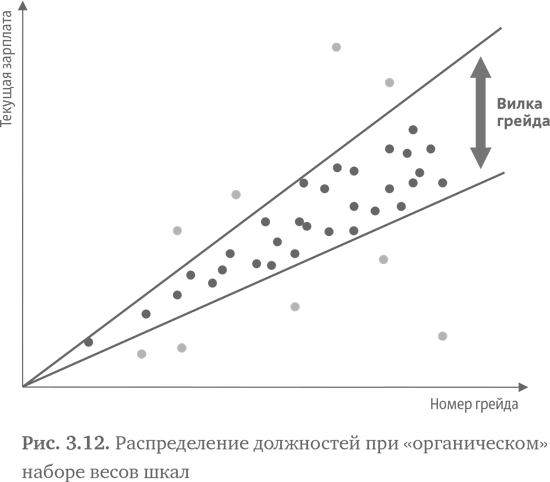 В органическом наборе может оказаться, что «условия труда» имеют максимальный вес, «цена ошибки» – весьма умеренный, а «вклад в стратегию» – нулевой, т. е. в реальности при назначении оклада вклад в стратегию не учитывался вообще, а вот условия труда (легкие или тяжелые) являлись основополагающим фактором. При этом теперь достаточно скорректировать зарплаты 10 % людей в минус и 20 % людей в плюс, чтобы «врасти» в грейды – тем самым мы по сути дела закрепим, «возведем в закон» фактически сложившиеся приоритеты в определении оклада (см. рис. 3.12).