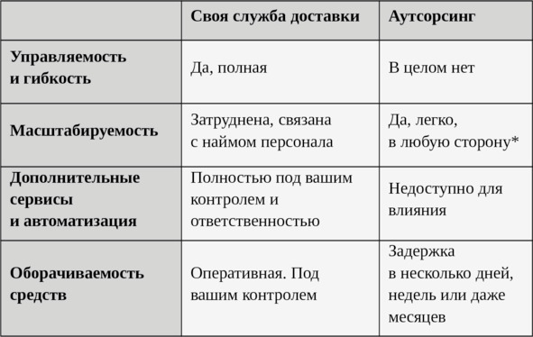 Для начала сравним ключевые достоинства и недостатки своей службы доставки (даже если она состоит из одного курьера) и аутсорсинговой компании.