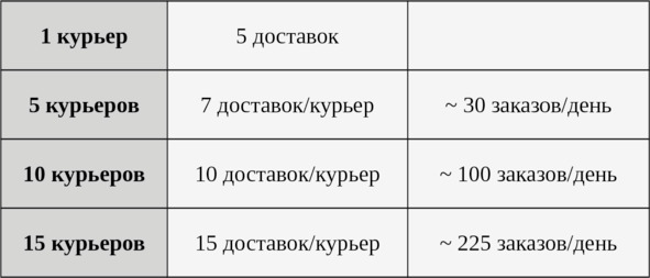 Так что, если вы решились, вот вам еще одна табличка. Зависимость количества доставок от количества курьеров. Конечно же, эта табличка актуальна только для Москвы или Санкт-Петербурга. Во многих других российских городах всё окажется немного иначе и будет зависеть от транспортной инфраструктуры и размера города. Эти данные я получил от курьерской службы Shop-Logistics, создатель которой – бывший «магазинщик» Андрей Кистенёв, столкнувшийся в своё время с большим количеством сложностей при работе с курьерскими компаниями и решивший сделать свою, лишенную недостатков. Правда, на практике Shop-Logistics «косячит», как и остальные.