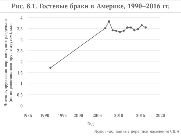 В некотором смысле этот тренд перекликается с гостевыми браками из первых «Микротрендов», где отмечался двукратный рост числа пар, живущих вместе «наездами», за период с 1992 по 2005 г. За минувшее десятилетие число таких браков стабилизировалось на уровне 3,4–3,8 млн, и такой образ жизни больше не считается чем-то исключительным. И в любом случае разнообразие способов раздельного существования супружеских пар лишь возросло.