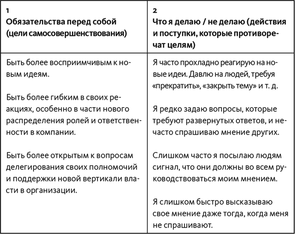 Скрытые приверженности, которые «поработили» Питера, конкурируют с целями самосовершенствования, заявленными в колонке 1. Сам он сформулировал их так.