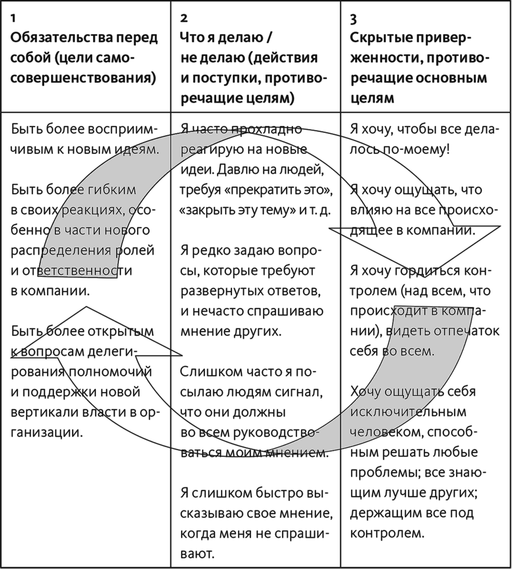Вспомним, что говорил известный психолог Уильям Перри о двух важных моментах, которые необходимо знать, помогая другим измениться: «Каких перемен эти люди действительно хотят (колонка 1) и на что они готовы пойти, чтобы избежать этих перемен?» (колонка 2). Преимущество нашей «рентгеновской технологии» в том, что она помогает нам понять и третий важный момент: почему люди проявляют такое упорство в своих поступках, отраженных в колонке 2, которые не дают им добиться того, к чему они стремятся? Для этого мы должны изучить колонку 3, в которой изложены скрытые приверженности, противоречащие главной цели (целям).