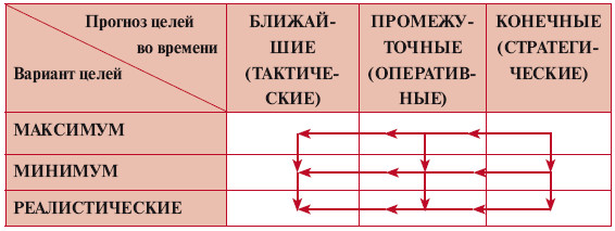1. Поскольку ближайшие и промежуточные цели должны быть подчинены достижению конечных целей, сначала разрабатывается блок стратегических целей. Определяется конечная программа-максимум, затем – программа-минимум и, наконец, конечная реалистическая программа. Конечная цель-максимум не должна быть плодом фантазии. Она определяется исходя из прогноза наилучшего, но все же реального развития ситуации. Это же относится и к конечной цели-минимум.