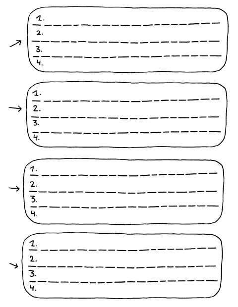 Творческие личности, все время работающие над рядом небольших проектов, чаще всего не нуждаются в подробных стратегиях. Статья или картинка, урок со студентами или небольшая музыкальная зарисовка для вечеринки — достаточно простая задача, чтобы не расписывать ее на отдельные шаги. Здесь достаточно перечислить, что в каком порядке отрабатывать. Например, мне нужно написать статью про тендер в дизайн-агентстве, вторую — про творческий кризис и третью — об определенной технике придумывания сюжетов для картинок. Все эти темы мне либо дали заказчики, и я согласилась, потому мне есть что об этом написать, либо я сама решила опубликовать свои мысли по волнующей меня теме. То же самое с небольшими иллюстрациями: чаще всего имеется техническое задание с коротким перечислением всего, что нужно изобразить. К нему нечего прибавить: я начинаю компоновать на пустом прямоугольнике все что нужно, прямо в процессе придумывая оригинальные идеи и прикидывая как все это расположить и повернуть, чтобы было не совсем скучно.