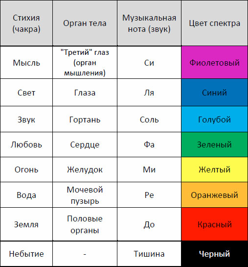 В Приложении представлена таблица соответствия энергетических уровней (чакр) и органов тела человека, а также представлено соответствие каждой чакры определенному цвету и звуку.