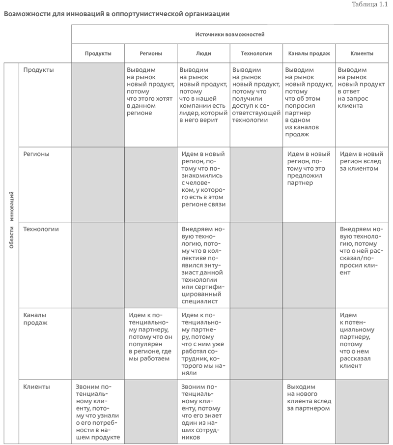 Важнейший принцип оппортунизма – видеть возможности во всем, что происходит вокруг. В табл. 1.1 приведены причины, которые могут служить основанием для тех или иных инновационных ходов оппортунистической организации.
