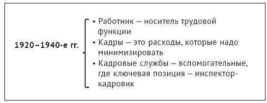 В начале XX в. развивалась технократическая концепция (в советской хозяйственной практике получившая название «управление кадрами»), в которой вместо человека как личности рассматривается его трудовая функция. Другими словами, работник – это физическая единица рабочей силы, не требующая к себе индивидуального подхода и отношения. В советские времена существовал термин «кадры», характеризовавший не качества отдельно взятого индивида, а совокупность работников, объединенных для достижения поставленных организационных целей. Кадровые службы выполняли в основном учетно-контрольные и административно-распорядительные функции (рис. 1).