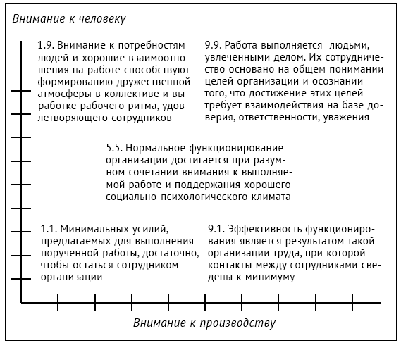 В связи с этим представляет интерес «решетка менеджмента», автор которой американский профессор Р. Блейк исходил из предпосылки, что любой результат достигается в пространстве между двумя «силовыми» линиями – производством и человеком (рис. 9). Первая «силовая» линия ориентирована на выполнение производственных заданий любой ценой, невзирая на персонал; вторая – на человека, на то, чтобы условия труда в наибольшей степени отвечали его потребностям и желаниям.