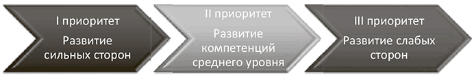 Мы предлагаем в самую первую очередь направить ресурсы на развитие сильных сторон и лишь во вторую, что называется, по остаточному принципу, инвестировать ресурсы в развитие сторон слабых, превращая их в зоны роста.