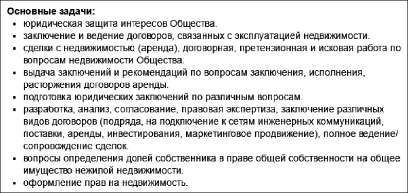 Приведу пример описания задач, способного заинтересовать кандидатов, для которых важны именно задачи. Вакансия «главный юрисконсульт» в крупной торговой компании.