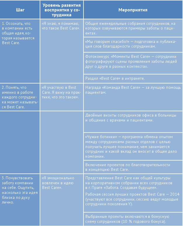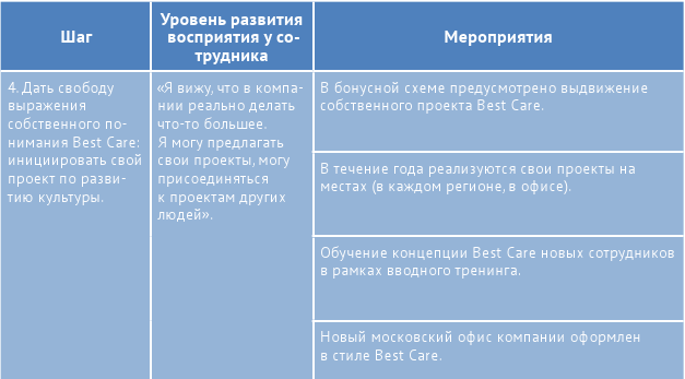 Основными этапами проекта можно назвать четыре шага (по уровню развития восприятия культуры Best Care у сотрудника):