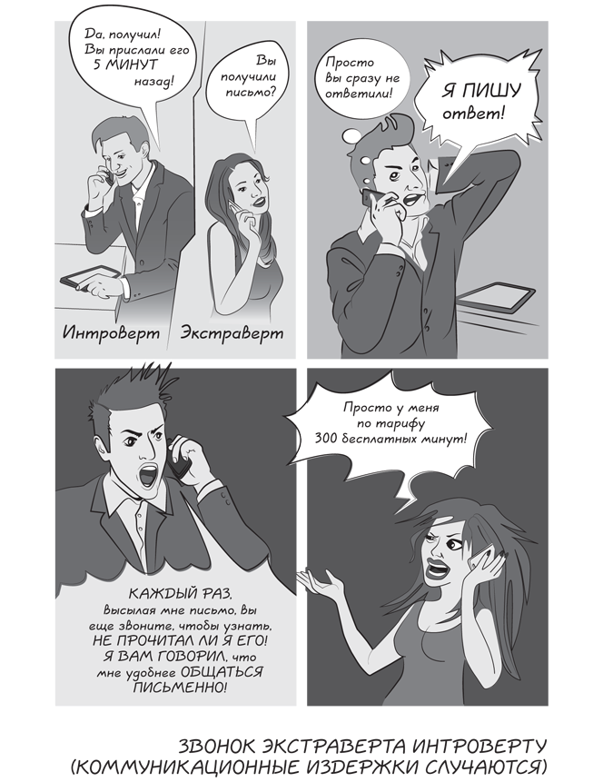 Чтобы избежать коммуникационных издержек и не испортить отношения с клиентом, проанализируйте его поведение в первые минуты встречи и решите для себя, кто он – интроверт или экстраверт. Если он интроверт, то, наверное, не стоит звонить ему каждые пять минут, одного письма вполне достаточно. Если же он экстраверт, то ему лучше позвонить, а не писать длинное письмо, дочитать которое у него не хватит терпения.