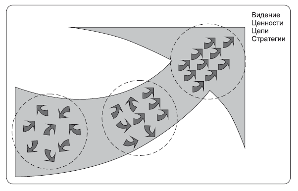 График в виде стрелы очень наглядный. Когда я воспользовалась подобным рисунком, чтобы описать, на что похоже нарушение нормальной деятельности организации, и изобразила множество стрелок, идущих в разных направлениях, слушатели сразу же поняли меня. Они поняли, что есть отдельные люди и/или команды, желающие делать правильные вещи – работать для достижения общей цели. Но без согласования ценностей, целей и стратегий организации слаженности не будет. Люди, которые являются официальными руководителями, должны, проводя изменения, действовать с упреждением (проактивно), а не просто говорить, какие потребности нужно удовлетворить. Когда существует ясность относительно того, в каком направлении должна двигаться организация, стрелки начинают выстраиваться вокруг руководителей.