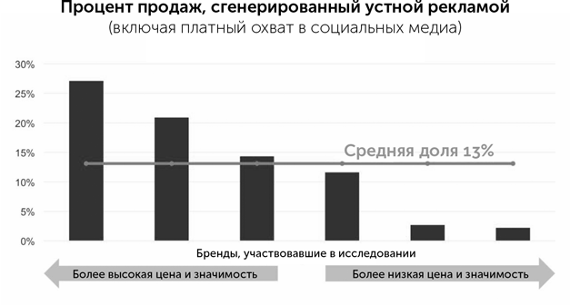Не только вы рассказываете истории о себе вашим потребителям, но и ваши потребители рассказывают истории о вас. Ассоциация устного маркетинга установила, что истории, которые люди рассказывают о бренде и его продуктах/услугах своим друзьям, генерируют около 13 % всего объема продаж{18}. Ассоциация также сообщила, что отзывы потребителей приобретают тем большее значение, чем дороже продукты и услуги (смотрите диаграмму).