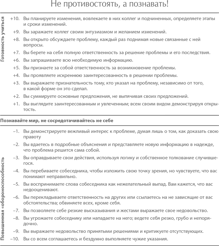 Если, например, к вам относятся первые два утверждения из второй десятки (–1 и –2), вы, скорее всего, привыкли занимать оборонительную позицию и не слишком расположены учиться. Попробуйте оценить поведение коллег и подчиненных и внести соответствующие коррективы в свое поведение. Например, если кто-то из них набирает слишком много «отрицательных» очков, значит, он не умеет воспринимать критику. Поэтому не тратьте понапрасну слов: он вас не услышит. Лучше сделайте паузу и выслушайте его. Если он увидит, что вы искренне пытаетесь понять его точку зрения, он, может быть, перестанет оправдываться и выслушает вас. Кроме того, вы можете проанализировать ваши взаимоотношения с людьми. Допустим, вам нужно сделать замечание подчиненному. Ваша цель – помочь ему, но вас раздражает качество его работы. Поэтому по форме и содержанию ваша критика носит оттенок обвинения (–6). Жертва немедленно занимает оборонительную позицию и/или пускается в объяснения (–1, –2 или –3). Вы начинаете критиковать его более жестко: говорить резкости, вести себя грубо, даже угрожать (–7 или –3). Не желая оправдываться и унижаться, подчиненный замолкает и соглашается (–10), после чего идет жаловаться на вас коллегам (–9). Каков результат неправильного взаимодействия? Ошибочно принимая уступку за согласие, вы думаете, что преподали подчиненному хороший урок и решили проблему, но на самом деле он ровным счетом ничему не научился (так же, впрочем, как и вы).