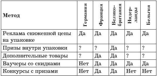 Стимулирование сбыта в странах ЕС можно проводить лишь при условии, что вы определили, какие методы юридически разрешены, какие нет. Например, согласно информации Ж. Ж. Ламбена («Менеджмент, ориентированный на рынок», допустимые методы стимулирования для некоторых стран таковы: