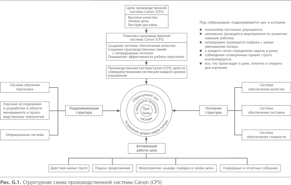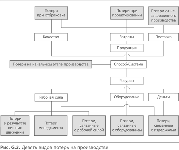 В производственной системе Canon (CPS) оцениваются действия по устранению девяти видов потерь. Менеджмент компании убежден, что использование такой классификации помогает людям 1) осознать проблему, 2) перейти от улучшения операций к системному совершенствованию и 3) понять необходимость саморазвития. Рис. G.3 показывает структурную схему девяти видов потерь в понимании Canon.