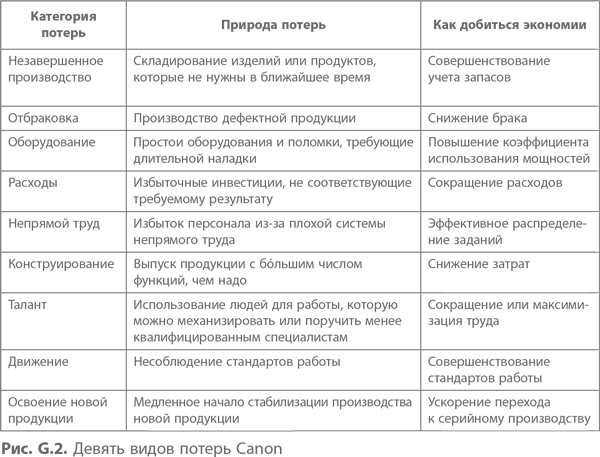 Что касается потерь, они не всегда очевидны и часто скрыты за каждодневной рутиной. Без определения четких критериев трудно сказать, следует ли браться за их устранение, поэтому производственная система Canon (CPS) выделяет девять видов потерь, показанных на рис. G.2.