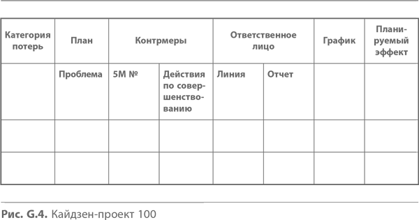 Конечная цель снижения потерь развертывается высшим менеджментом вниз, на уровень цехов, и на каждом из них ежегодно определяются конкретные цели. На одном из заводов Canon развернут «Проект совершенствования-100» (Improvement Project 100). На рис. G.4 показан листок, используемый в ходе его реализации.
