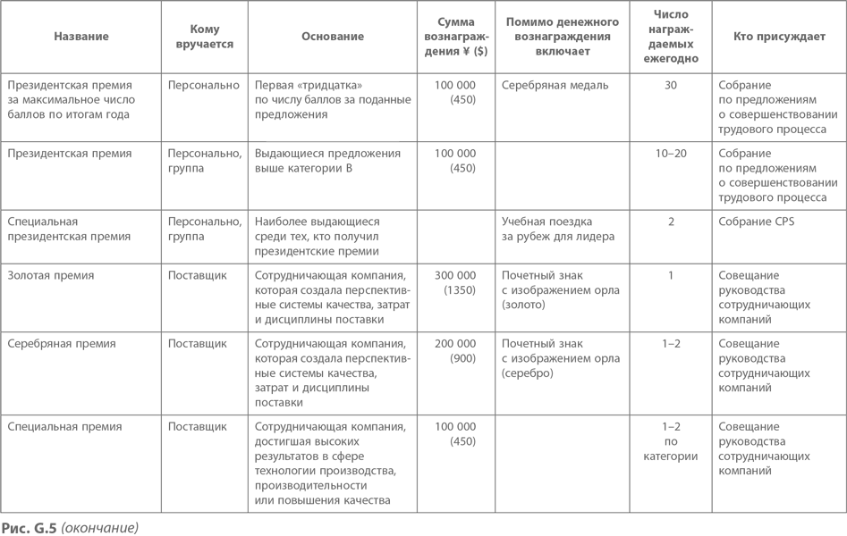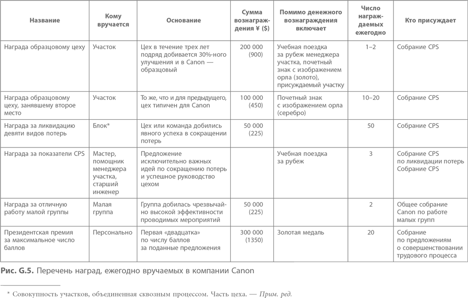 На рис. G.5 дан перечень ежегодно вручаемых в компании Canon наград, которые делятся на 3 вида: персональные, для малых групп и для цехов. Их присуждение должно продемонстрировать, что менеджмент высоко ценит усилия и результаты работы своих сотрудников.