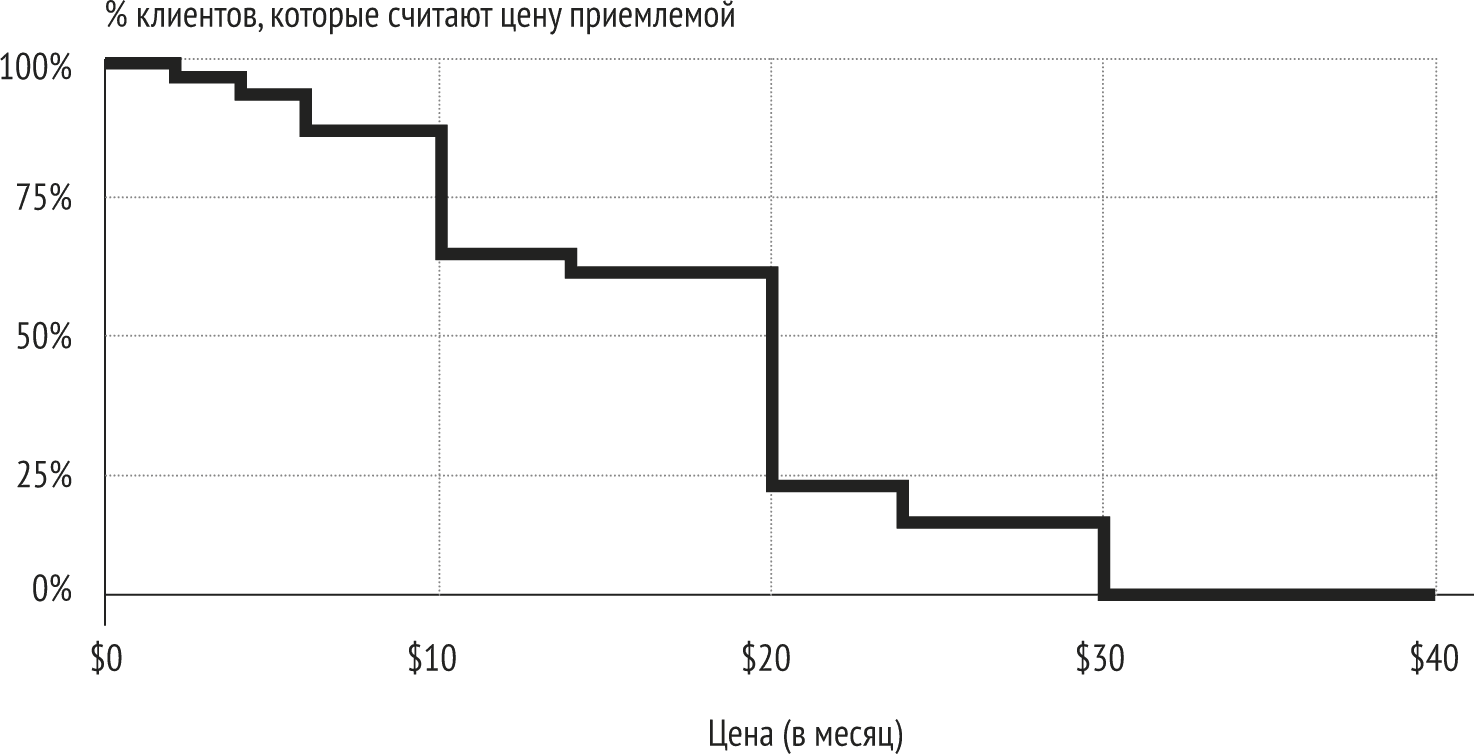 Инновационная команда выбрала несколько сотен потенциальных клиентов, чтобы выяснить, сколько они готовы платить. Во-первых, они объяснили концепцию нового продукта и функций, которые собирались разработать. Затем постарались понять, видят ли клиенты какую-либо ценность в этой концепции. Главное, они спросили клиентов, готовы ли те платить. Оказалось, что клиентам понравилась концепция, и они готовы заплатить от $10 до $20 за ежемесячную подписку, как показано на рис. 11.