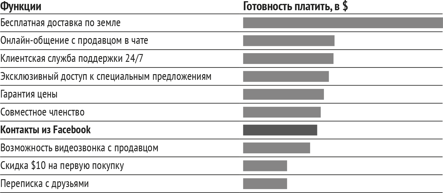 Разговор с клиентами продемонстрировал, что они готовы платить за продукт компании. Менеджеры действовали уже не вслепую. Затем инновационная команда шагнула еще дальше и выяснила, за какие именно функции клиенты хотят платить. Перед разговором с клиентами команда считала, что одна из самых крутых функций – та, которая позволяла покупателям видеть, пользовался ли кто-то из их контактов на Facebook услугами того продавца, который их заинтересовал. Команда считала, что эта функция сыграет важнейшую роль в создании доверия. Они с таким энтузиазмом разрабатывали ее и приоритизировали как основную функцию. Конечно, клиенты захотят заплатить за нее, как и за все остальные функции, не так ли?