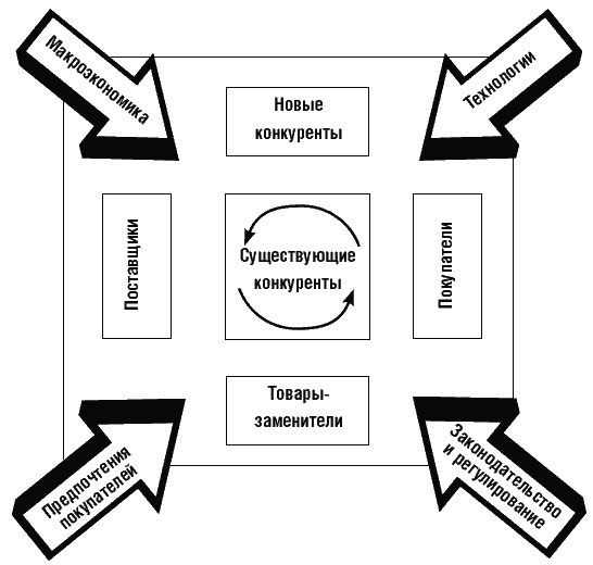 ? Каждый блок структуры, из пяти вышеприведенных, определяется специфическими факторами. Наша задача заключается в том, чтобы выявить те факторы, которые определяют в данный момент структуру выбранного рынка и/или отрасли. Затем мы попытаемся предсказать, как различные силы (поставщики, покупатели, товары-заменители, конкуренты и потенциальные конкуренты) смогут повлиять на ваш рынок и, следовательно, на ваш бизнес.