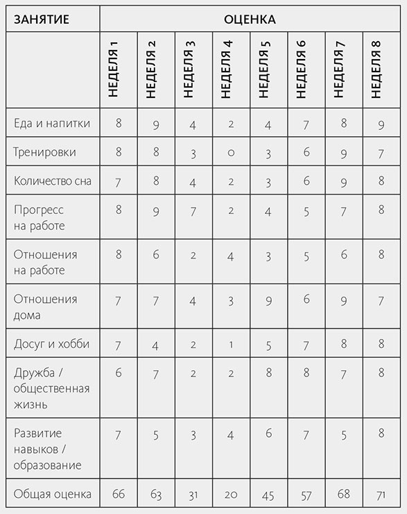 Оцените свой результат по каждому занятию – насколько хорошо или плохо вы к нему относитесь. Воспользуйтесь шкалой от 0 до 10, где 10 – высшая степень хорошего отношения, 5 – средний показатель, а 0 – крайне плохое отношение. Рекомендую делать это раз в неделю, так как проводить оценку ежедневно не всегда удобно.