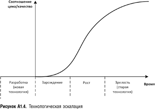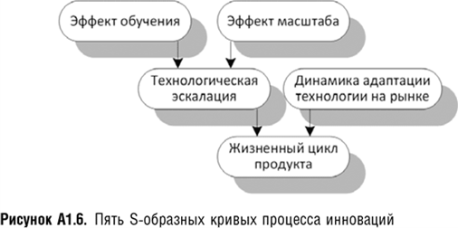 Обратите внимание, что в совокупности мы получаем пять взаимосвязанных S-образных кривых. Их взаимосвязь начинается с того, что эффекты обучения и растущего масштаба совместно обеспечивают технологическую эскалацию. Эскалация в сочетании с динамикой рынка приводит к формированию жизненного цикла продукта. Эта последовательность представлена на рис. А1.6.