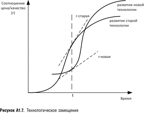В случае технологического замещения на графике появляется вторая S-образная кривая, которой описывается развитие новой технологии. При этом коэффициент соотношения цены и качества не обязательно выше, чем у старой технологии. А теперь представьте ситуацию, изображенную на рис. А.1.7. Символом r обозначим соотношение цены и качества.
