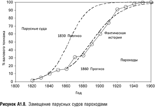 Другим коварным феноменом является способность старых технологий к нанесению ответного удара. Рассмотрим рис. A1.8, на котором показано замещение парусных судов пароходами в XIX в.[267]