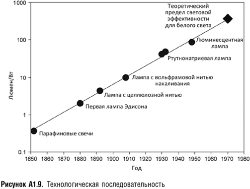 Долгосрочное доминирование на рынке можно обеспечить серийным замещением, т. е. запуском новой инновации, пока предшествующее нововведение еще не достигло своей зрелости. Такие «серийные самоубийцы» становятся своими же наиболее серьезными конкурентами, поскольку предлагают новую технологию, едва лишь предыдущая освоена конкурентами. Тем самым компания обеспечивает себе наилучшие конкурентные позиции, поскольку компании, способные реализовать серийное замещение, становятся недосягаемыми для конкурентов и обретают «устойчивое» лидерство. В 1960-х и 1970-х гг. корпорация IBM вывела на рынок несколько поколений больших ЭВМ до того, как конкуренты в полной мере осознали происходящее. Сегодня миссия корпорации Sony заключается в «уничтожении собственной продукции». Она ведет борьбу с собственными ЖК-телевизорами, выпуская плазменные панели, а доступные цифровые фотокамеры высокого разрешения были предложены потребителям еще тогда, когда процесс замещения традиционных фотоаппаратов цифровыми был в полном разгаре. Компания Philips находится в авангарде новых технологий для систем освещения. Последовательность технологических замещений для систем освещения показана на рисунке A1.9[270]. Обратите внимание на физический предел развития технологии, поскольку соотношение светового потока (люмен) к мощности светильника (Вт) не может превышать 100-процентную точку эффективности. Мы называем серию последовательных технологических замещений «технологической последовательностью», и соперничающая технология должна занять на графике более высокое положение, чтобы сделать ее применение целесообразным. Угроза для кажущихся недостижимыми позиций на рынке, появляющаяся в результате развертывания технологической последовательности, часто зарождается внутри самых неожиданных компаний. Любого, кто в 1960 г. предположил бы, что компания Texas Instruments станет конкурентом швейцарской часовой промышленности, подняли бы на смех. Тем не менее электронные часы вытеснили бы с рынка механические, если бы не появление новой тенденции, сделавшей часы в большей степени предметом моды, чем инструментом для определения времени. Первой реакцией швейцарских часовщиков было: «Клиенты всегда предпочтут настоящую вещь» (при этом под «настоящей вещью» всегда понимается старая технология; это яркий пример поведения страуса, прячущего голову в песок). Производители механических весов и фотоаппаратов использовали тот же довод. Отсюда урок: всегда избавляйтесь от акций компаний, которые руководствуются подобными аргументами. Корпорация IBM сначала совершенно недооценила роль персональных компьютеров, а затем роль программного обеспечения для них. Корпорация Sony может столкнуться с тем, что само телевидение уйдет в прошлое, когда его заменят интернет-технологии, а плазменные телевизионные панели станут музейными экспонатами.