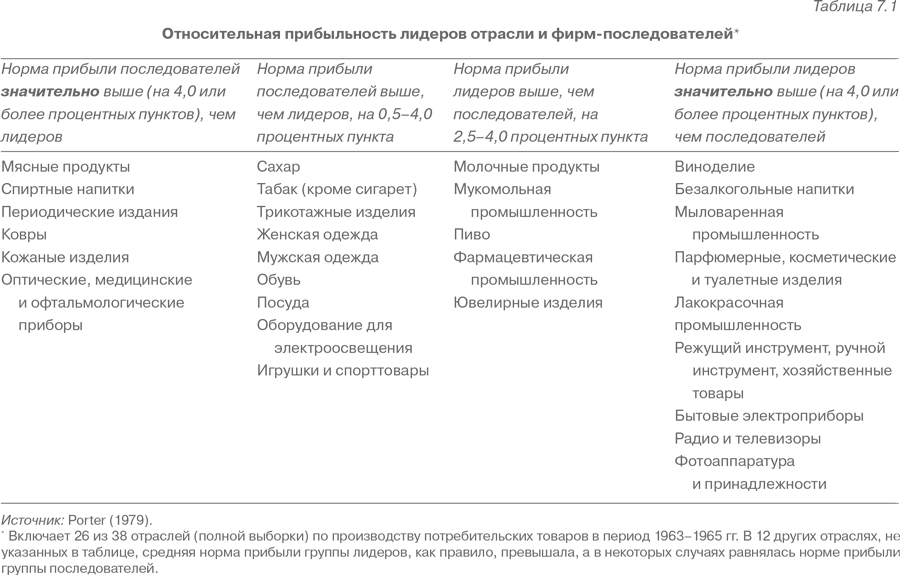 Эмпирические данные свидетельствуют о том, что соотношение между прибыльностью фирм, имеющих различную долю рынка, зависит от условий в отрасли. В табл. 7.1 представлены сравнительные показатели нормы прибыли на акционерный капитал крупнейших фирм, на долю которых приходится не менее 30 % объема продаж в отрасли (лидеров), и средних по масштабам фирм той же отрасли (последователей). В этих расчетах мелкие фирмы с активами менее 500 тыс. долл. были исключены. Несмотря на то что некоторые из представленных отраслей определяются весьма широко, поразительным является тот факт, что в 15 из 38 отраслей последователи были заметно более прибыльны, чем лидеры. Норма прибыли последователей, как правило, оказывается выше в тех отраслях, где экономия на масштабе либо незначительна, либо отсутствует (одежда, обувь, посуда, мясные продукты, ковры) и/или которые характеризуются высокой степенью сегментации (оптика, медицинские и офтальмологические приборы, спиртные напитки, периодические издания, ковры, игрушки и спортивные товары). Норма прибыли лидеров, как правило, выше в отраслях с интенсивным использованием рекламы (мыло, парфюмерия, безалкогольные напитки, мукомольная промышленность, в том числе хлебные изделия, режущий инструмент) и/или с масштабными исследованиями и разработками и экономией на масштабе в производстве (радио и телевизионные приемники, фармацевтика, фотоаппаратура). Эти данные соответствуют нашим ожиданиям.