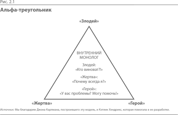 У альфа-треугольника три стороны: «злодей», «жертва» и «герой» (см. рис. 2.1). Каждый персонаж немыслим без двух других: «злодеи» всех обвиняют, «жертвы» постоянно жалуются, «герои» спасают положение. Все действующие лица чего-то жаждут: «злодей» – власти, «жертва» – сочувствия, «герой» – восторгов и признания. Все по-своему правы. «Злодеи», действуя из благих побуждений, требуют, чтобы все было сделано хорошо и с наименьшими затратами. Но проблема заключается в том, что они используют неправильные средства достижения цели. Они думают, что помогают людям, но те, напротив, пребывают в уверенности, что их не понимают и не ценят, что к ним плохо относятся и даже оскорбляют. Третья сторона альфа-треугольника – «герой», способный решить любую проблему: урезонить разбушевавшегося «злодея» или, наоборот, утереть слезы несчастной «жертве». В большинстве организаций нет недостатка в претендентах на роль героя.