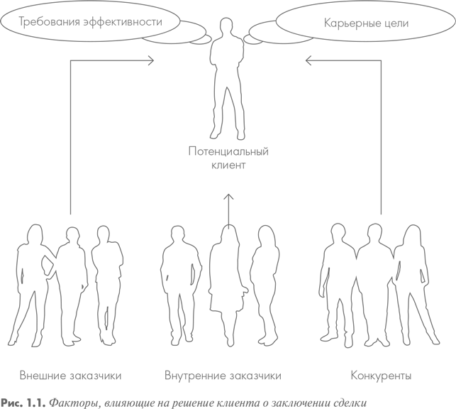 Кто все эти люди, изображенные на рис. 1.1? В категорию «внутренние заказчики» входят начальники, члены совета директоров, коллеги и сотрудники других подразделений. Они устанавливают пределы суммы, которую может потратить ваш потенциальный клиент, и даже способны препятствовать завершению сделки. У внутренних заказчиков свои интересы – о них вам нужно узнать как можно скорее по ходу сделки. Часто их интересы противоречат друг другу и ведут к спорам между сотрудниками внутри компании. Если вам удастся выяснить, что мотивирует и что беспокоит внутренних заказчиков вашего потенциального клиента, вы сможете разрядить обстановку и продолжить проведение сделки. К «внешним заказчикам» относятся те, кто ведет бизнес с вашим потенциальным клиентом. Именно их потребности он стремится удовлетворить, поэтому вам нужно собрать о них как можно больше информации, чтобы лучше понять, что движет вашим потенциальным клиентом. Если он несет высокую административную ответственность, то непременно постарается узнать, как предлагаемые вами решения могут помочь ему в деловых операциях с внешними заказчиками.