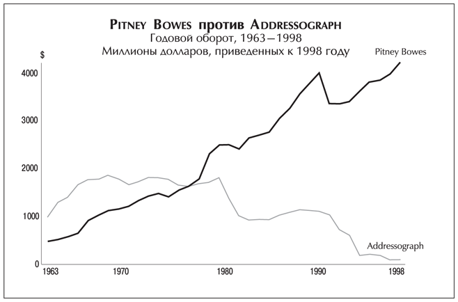Сравните Pitney Bowes и Addressograph. Трудно найти две другие компании в более схожих ситуациях в определенный момент их истории, пути которых разошлись бы так кардинально. До 1973 года у них были приблизительно одинаковые оборот, прибыль, число сотрудников и стоимость акций. Обе компании считались почти монополистами на своих практически идентичных рынках: Pitney Bowes – в машинах для сортировки писем, а Addressograph – в машинах, копирующих адреса, и обе столкнулись с неизбежностью потери своих монополий{132}. Однако к 2000 году Pitney Bowes имела более 30 тысяч сотрудников и оборот более $4 млрд, а жалкие остатки Addressograph довольствовались $100 млн оборота, имея только 670 сотрудников{133}. Для акционеров разница между Pitney Bowes и Addressograph выразилась в отношении 3581 к 1 (да, в три тысячи пятьсот восемьдесят один раз больше).