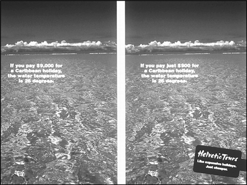 В индустрии развлечений простор для творчества еще больше. Представьте себе две абсолютно одинаковые картинки с видами лазурной морской воды (рис. 111). Заголовок слева: «Если вы заплатили $3000 за отдых на Карибских островах, то температура воды составит 26 °С». Справа: «Если вы заплатили всего $900 за отдых на Карибских островах, то температура воды составит 26 °С».