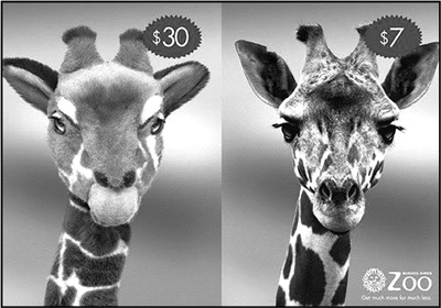 «Получай большее за меньшие деньги». Под таким девизом развернул агитационную кампанию зоопарк Буэнос-Айреса (рис. 113–115). Что сделали аргентинские рекламисты?