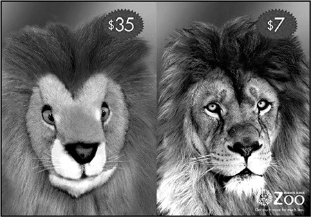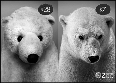 Разыскали плюшевые игрушки, которые выглядят как настоящие звери. При сопоставлении они получились на загляденье похожими. И сравнили их стоимость с ценой входного билета в зоопарк. Общение с живыми львами, жирафами и белыми медведями оказалось в четыре-пять раз выгоднее.