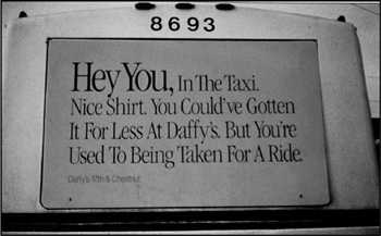 «Эй, ты, который в такси. Роскошная рубашка. В Daffy’s мог бы купить ее дешевле. Но ты ведь привык быть обманутым» (рис. 117).