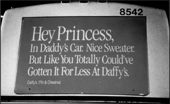 «Эй, принцесса в папиной тачке. Шикарный свитерок. Точно такой же ты могла бы купить в Daffy’s дешевле» (рис. 118).