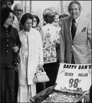 Основатель компании Ирвин Шульман (Irving Shulman) активно использовал вызывающие, нестандартные рекламные акции с момента открытия первого универмага Daffy’s в 1961 году. Так однажды в магазинах продавались серебряные доллары за 88 центов (рис. 120). Для привлечения внимания прохожих Шульман подвешивал под потолок манекены. С улицы людям казалось, что это покупатели в торговом зале прыгают от счастья.