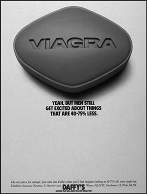 Вот один из современных примеров рекламного творчества Daffy’s (рис. 121). Огромную таблетку виагры сопровождает пояснение: «Да-а-а, но мужчин все еще возбуждают вещи, которые продаются со скидкой в 40–75 %».