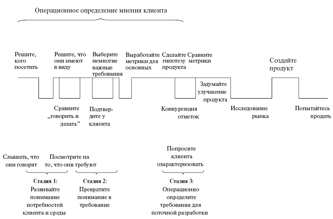 Цель всего процесса производства продукта – перейти от неясного ощущения клиента к физическому продукту или ощутимой услуге, которые удовлетворят действительные нужды клиента (рис. 5.21). Три стадии операционного определения требований клиента превращают невидимое или неясное ощущение в ясные утверждения требований клиента. Они, в свою очередь, структурируются в измеряемые параметры, на которых построится процесс технической разработки. One-рационные определения требований клиентов обеспечивают мостик между качественными нуждами клиентов и обязательно количественным техническим процессом, который и выдает физический продукт.