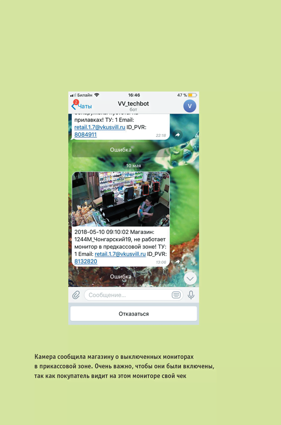 Например, при отмене чека кассиром сообщение приходит помощнику управляющего по рознице. Поэтому в наших магазинах для отмены чека не нужно ждать старшего продавца, чтобы тот физически подтвердил операцию. Каждый кассир уполномочен сделать это самостоятельно и прекрасно знает, что частая отмена чека вызовет вопросы у помощника по рознице, ведь о каждом случае отмены станет известно сразу.