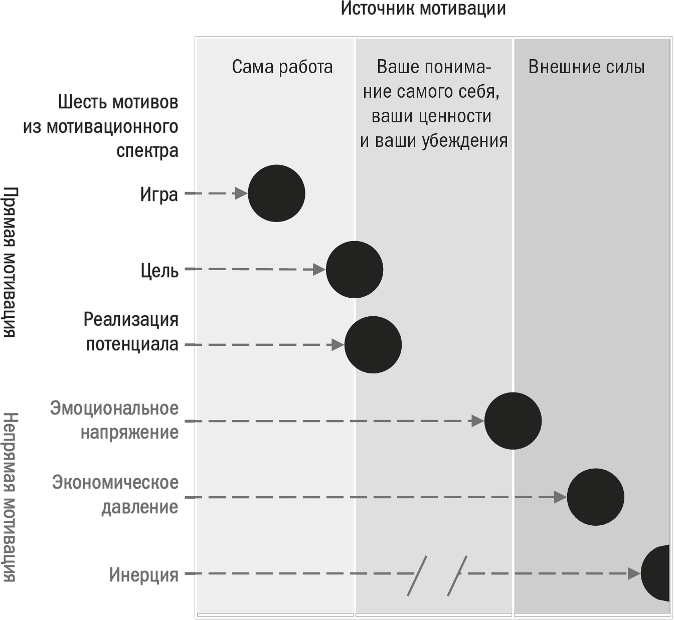 Оказывается, существует спектр причин, по которым люди вообще что-либо делают. Три из них, которые мы называем прямыми мотивами, напрямую связаны с деятельностью человека (в нашем случае с работой) и управляют ее эффективностью. Три других мотива – косвенные, или побудительные. Они отделены от самой работы и зачастую мешают достижению в ней высокой эффективности.