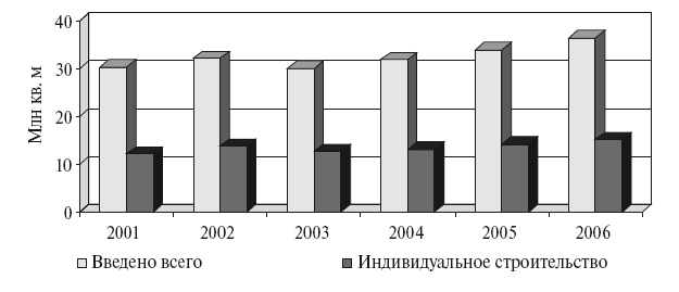 Жилой сектор по сравнению с нежилыми зданиями развивался в 2006 г. достаточно динамично: ввод жилых зданий в целом по России составил 42,84 млн кв. м. Доля индивидуальных застройщиков в общем объеме построенного в 2006 г. жилья составила 42,1% (рис. 1.4).