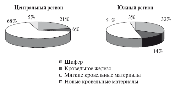 На первых местах по представленности в посреднических фирмах находятся металлочерепица, мягкая кровельная черепица, рулонные кровельные материалы и шифер. Несмотря на то что новые кровельные материалы чаще встречаются в ассортименте торговых и строительных фирм, шифер определенно лидирует в объемах продаж во всех рассматриваемых регионах.