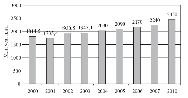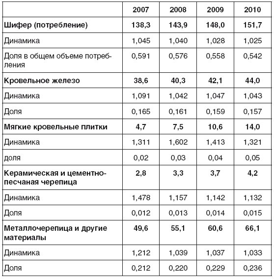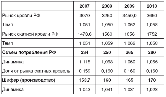 В среднем по России в ближайшей перспективе будет наблюдаться рост рынка с постепенным смещением от традиционного серого шифера и асбоцементных плиток к окрашенной продукции, из центра на периферию. До 2009 г., по оценкам, рост составит в среднем 3—5% ежегодно (рис. 1.7).